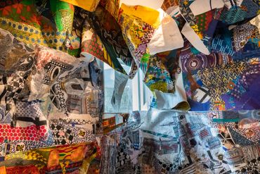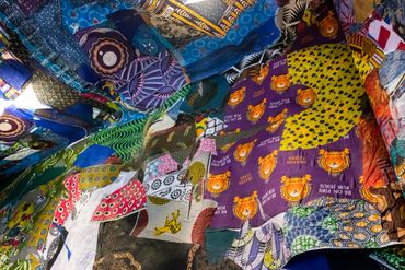 The site-specific installation predominantly consists of African wax, Kente, Batik and Tie and dye fabrics scraps, collected from seamstresses across Africa, the Caribbean, and the United States. Symbolically, it represents groups of women from diverse communities. The piece was created collaboratively with visiting families at the Children’s Museum of Manhattan NY. Through interactive processes that demonstrate a commitment to community, self-love and appreciation, and cultural and historical references. At the Katonah Museum of Art, Visitors are invited to add to the installation and enjoy a variety of hands-on activities that explore Family, fabrics, memories and portraiture. Whilst the collaboration creates a sanctuary space that celebrates unity in diversity, amplifying a community and self-love atmosphere where aliens become neighbors, and neighbors become family. There is a universal undertone to the installation, through the collected fabrics and portraits and communal process that highlights the commonalities of humanity and our shared experiences, as highlighted in the above Quran verse.